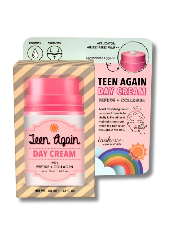 Crème de jour Look At Me Teen Again enrichie en peptides et collagène, hydrate intensément, revitalise la peau et s'absorbe rapidement pour un teint frais et lumineux.