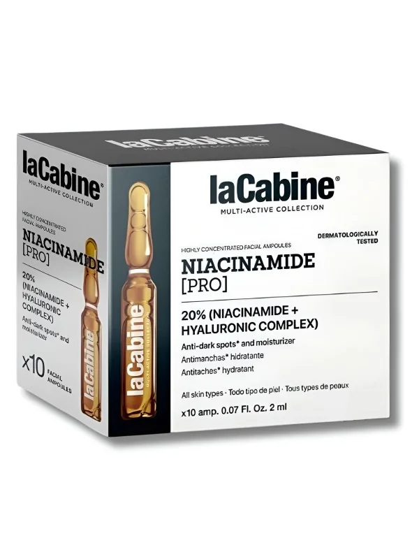Découvrez l'efficacité des Ampoules Niacinamide 20% Pro LA CABINE, un traitement intensif conçu pour corriger les taches et uniformiser le teint.