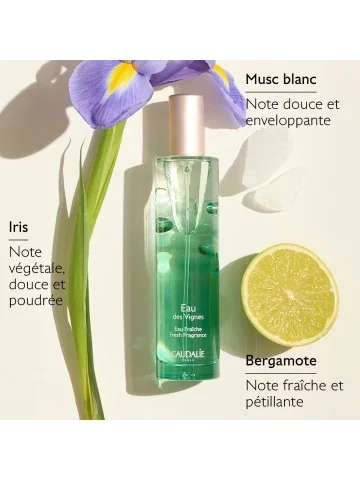 L’Eau Fraîche Eau des Vignes est un parfum de caractère qui transporte vos sens dans un jardin d’été au cœur des vignes. La bergamote pétillante se mêle à l’élégance de l’iris et à la sensualité du musc blanc.