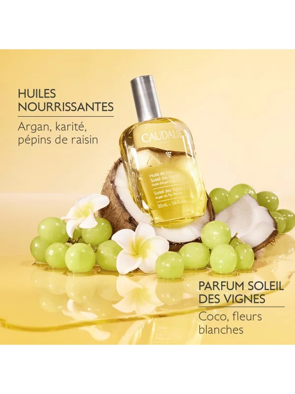 L'Huile de Soin Soleil des Vignes est une huile nourrissante pour le corps. Enrichie en huiles d'argan, de karité, de pépins de raisin et d'amande, elle améliore l'élasticité de la peau et l'illumine instantanément. Sa fragrance emblématique Soleil des Vignes révèle sur la peau des notes de coco, fleur d'oranger et jasmin… Une réminiscence de l'été tout au long de l'année."
