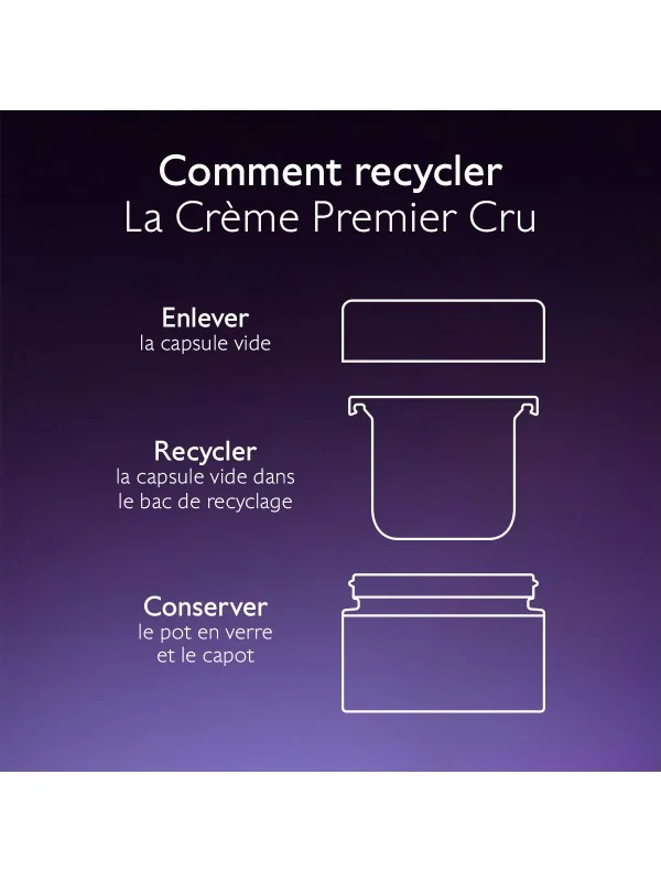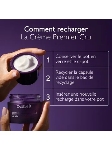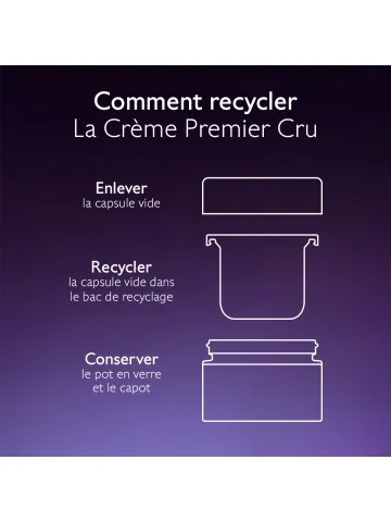 Appliquez matin et soir sur le visage et le cou, seule ou après votre sérum. La Crème Premier Cru est rechargeable : conservez le pot et remplacez uniquement la capsule vide.