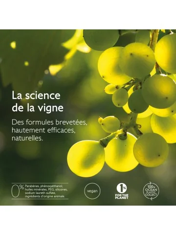 - Viniférine : extrait de sève de vigne, agit contre les taches et éclaire le teint