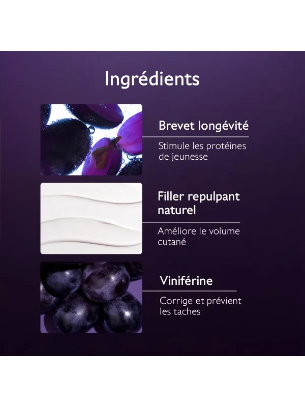 - Ingrédients clés : Viniférine, Brevet Longévité, Filler repulpant naturel
