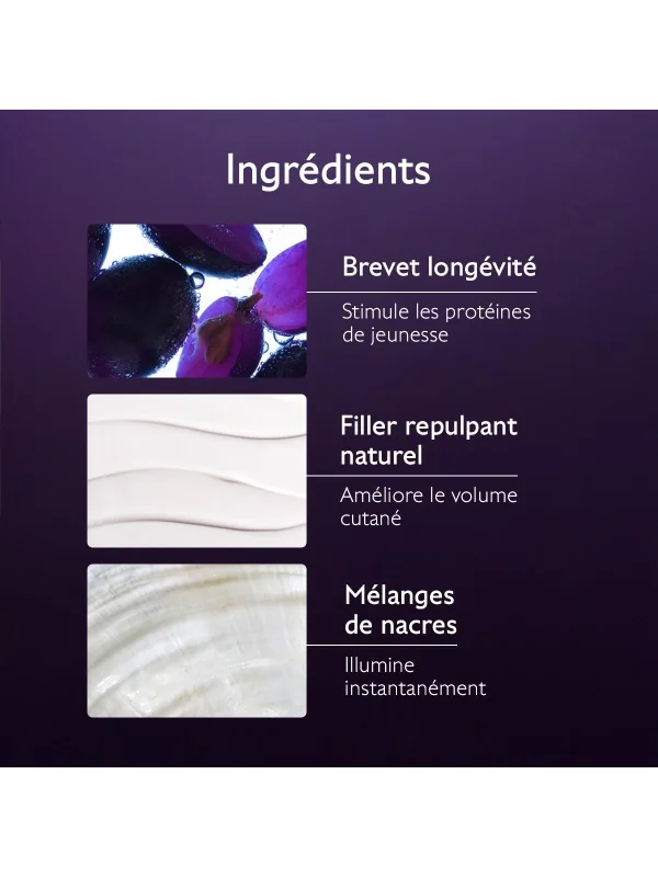 - Filler repulpant naturel : extrait issu du bois de rose, il stimule les molécules de jeunesse et les protéines densifiantes pour redéfinir les contours du visage.