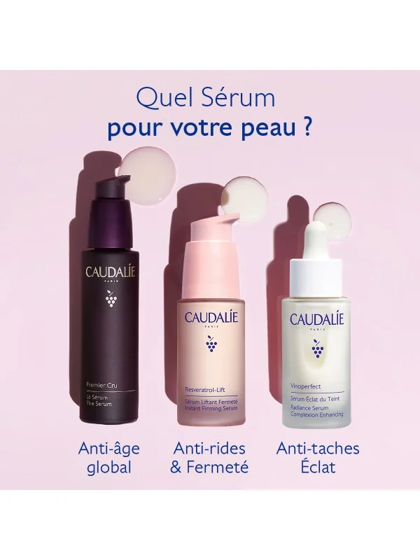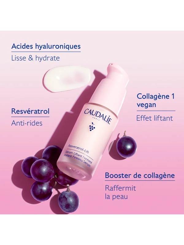 - Resvératrol : anti-âge breveté de Caudalie, raffermit et corrige les rides.