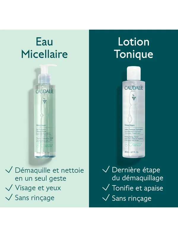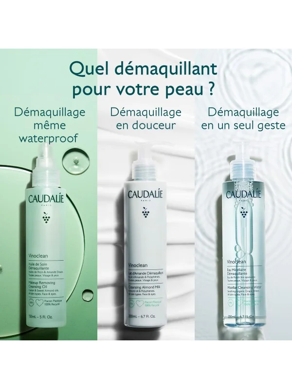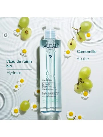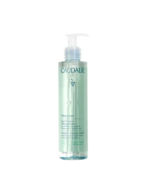 Caudalie Vinoclean Eau Micellaire : nettoie et démaquille visage et yeux, hydrate et apaise pour une peau douce, nette et confortable.