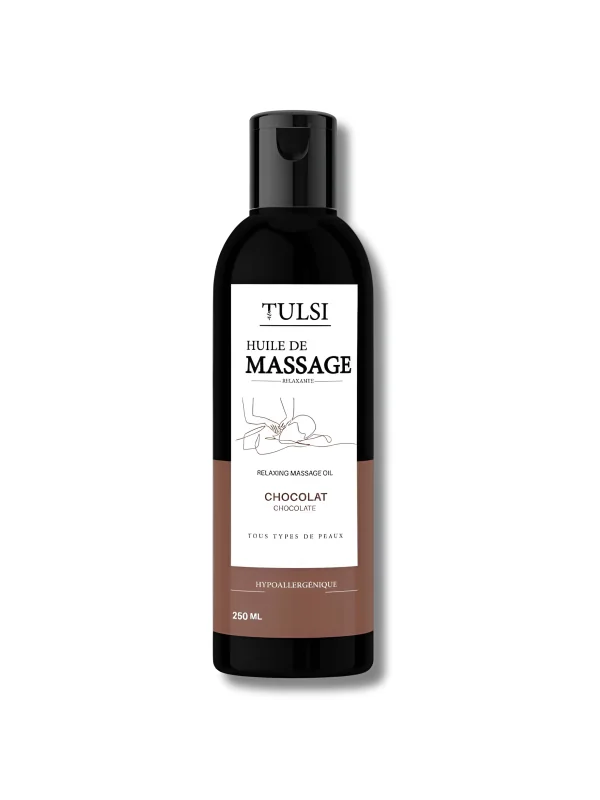 Huile de massage au parfum chocolaté, idéale pour hydrater la peau, faciliter le massage et offrir un moment de détente et de bien-être intense.