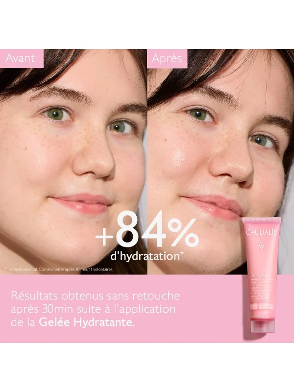 La Gelée Hydratante VinoHydra agit comme un véritable patch d'hydratation naturelle. Formulée sans silicones, sa texture gelée ultra-fraîche fond sur la peau sans laisser de fini gras, la rendant idéale pour les peaux mixtes, même sensibles. Dès l'application, la peau devient instantanément plus souple, comme gorgée d'eau, et le teint plus frais.