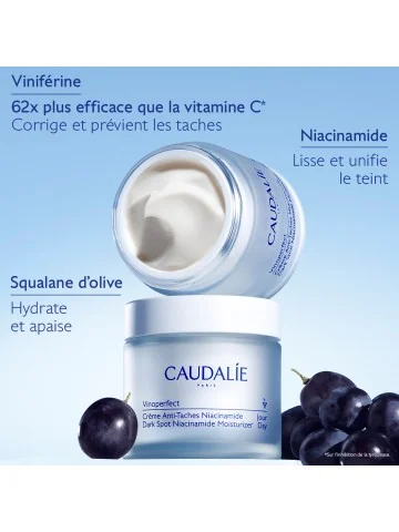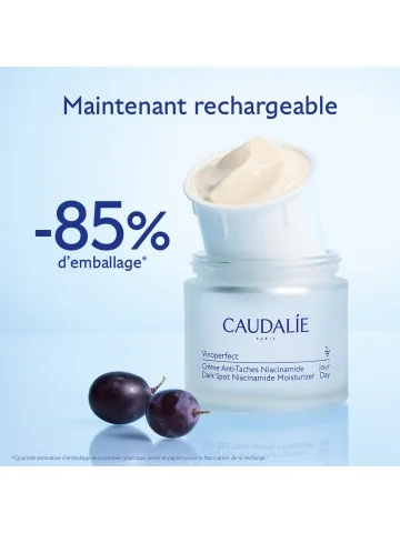 Inspirée du Sérum Vinoperfect, N°1 de l'anti-taches en France*, la Crème Anti-Taches Niacinamide Vinoperfect s'adresse à toutes les personnes qui souhaitent prévenir ou atténuer leurs taches pigmentaires, quelle que soit leur nature : soleil, âge, acné, grossesse, lumière bleue. Grâce à sa texture veloutée enrichie en Viniférine et Niacinamide, cette crème anti-taches convient à tous les types de peaux, même sensibles. Disponible en format recharge.