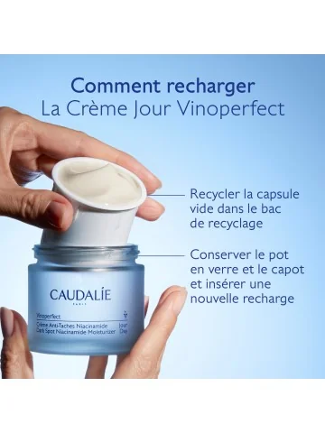 Le pot de la Crème Anti-Taches Niacinamide ou de la Crème Nuit Glycolique Anti-Taches Vinoperfect se recharge facilement grâce aux capsules. Ce système d'éco-capsules, plus respectueux de l'environnement, représente -85% d'emballage* à l'achat d'une recharge.