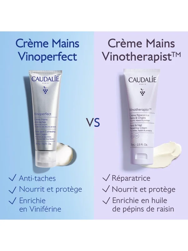 Enrichie en Viniférine, la Crème Mains Vinoperfect est spécialement conçue pour les mains sujettes aux taches, tandis que la Crème Mains Vinotherapist nourrit, répare, protège et fortifie les ongles.