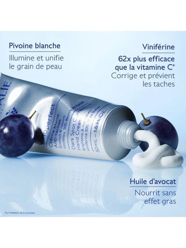 Spécialement conçue pour les mains, la Crème Mains Anti-Taches Vinoperfect estompe visiblement les taches brunes, prévient leur apparition et nourrit les mains sans laisser de film gras. Sa texture crème à la fois fine et onctueuse enveloppe la peau d'un confort absolu.