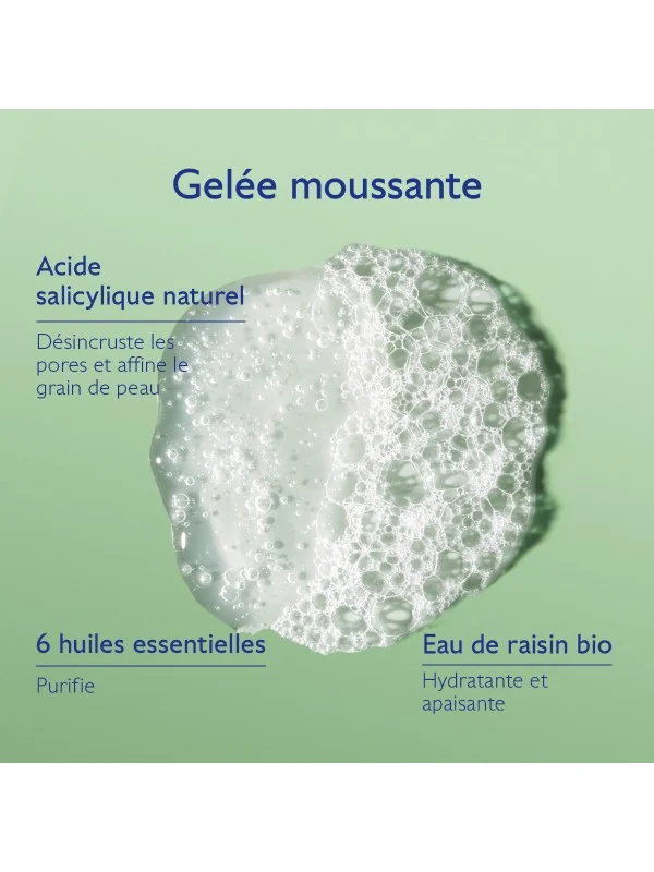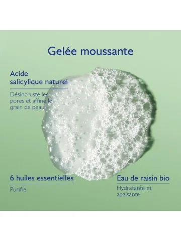 La Gelée Nettoyante Purifiante contient de l'acide salicylique naturel, à l'action kératolytique qui élimine les cellules mortes, tandis que les huiles essentielles et l'eau de raisin bio préviennent l'oxydation du sébum.