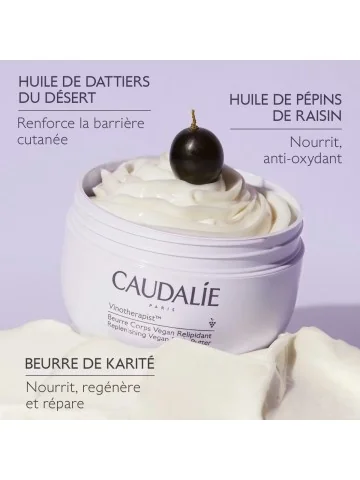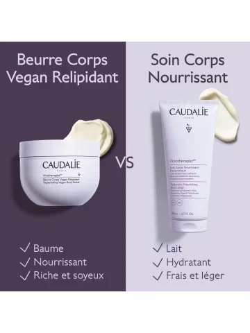 Le Beurre Corps Vegan Relipidant Vinotherapist™ est un soin hydratant anti-grattage, apaisant et nourrissant pour les peaux sèches à tendance atopique. Le Baume Lift & Fermeté Vinosculpt est un soin raffermissant qui agit simultanément sur les 4 zones clés de votre corps : bras, buste, ventre et fesses pour une peau plus ferme.