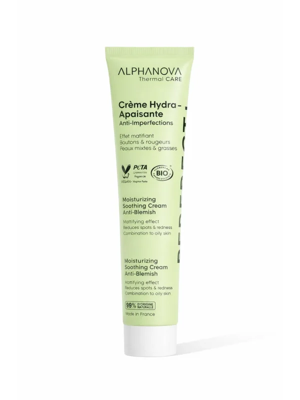 Crème Hydra-Apaisante Anti-Imperfections PERFECT+ Alphanova : soin bio qui hydrate, purifie, matifie et apaise les peaux mixtes à grasses tout en réduisant boutons, rougeurs et excès de sébum.