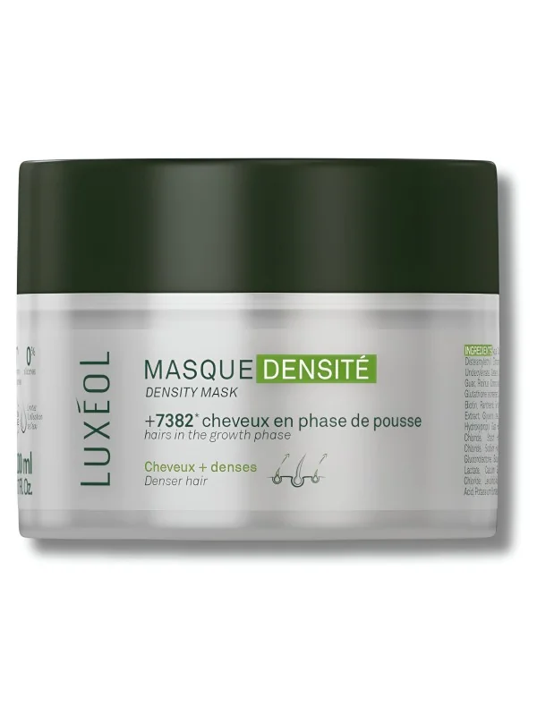 Masque Densité Luxéol : augmente la densité capillaire, renforce la fibre, nourrit intensément et favorise une repousse plus saine pour des cheveux plus forts, volumineux et brillants.