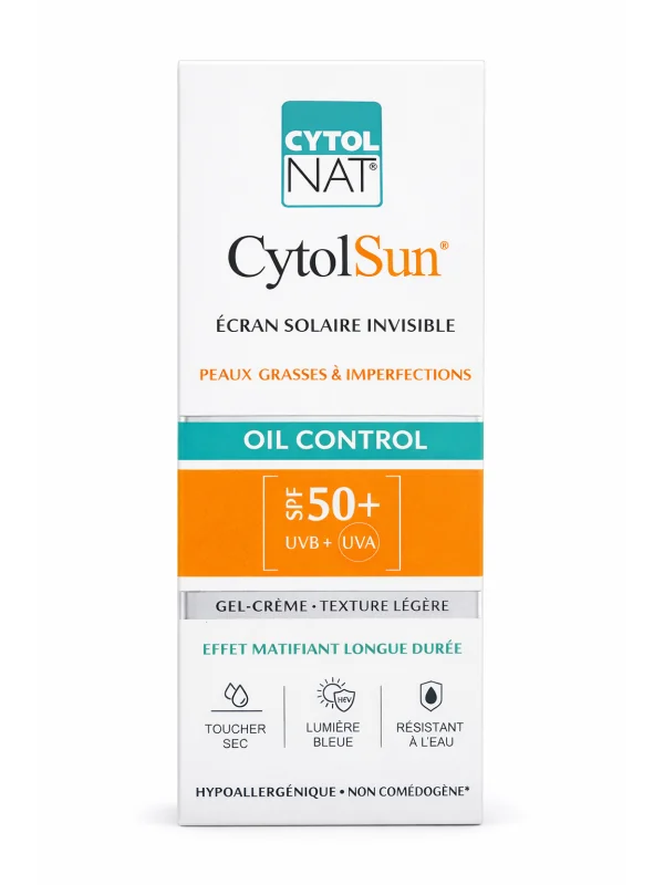 CytolSun Oil Control SPF 50+ : protection solaire très haute avec effet matifiant longue durée, idéale pour les peaux grasses et à tendance acnéique.
